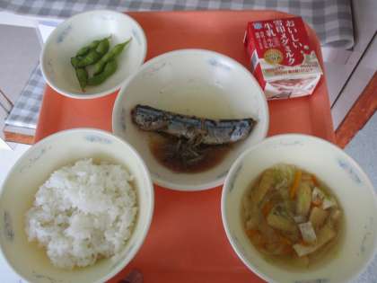ごはん、牛乳、さんまのしょうが煮、えだ豆、キャベツのすまし汁