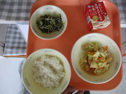 麦ごはん、牛乳、鶏ちゃん、ほうれん草ともやしのごま煮