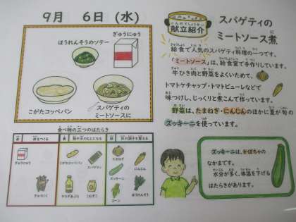小型コッペパン、牛乳、スパゲティのミートソース煮、ほうれん草のソテー