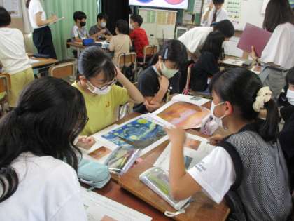 一人で作品を鑑賞する楽しみ方もいいですが、だれかと一緒に話をしながら作品を鑑賞するのもいいですね!6年生は、修学旅行で大塚国際美術館にも行き、アート作品に、たくさん触れることができています。芸術家にも興味をもっています。またお家でも、美術のお話をしてもらえたら嬉しいです!
