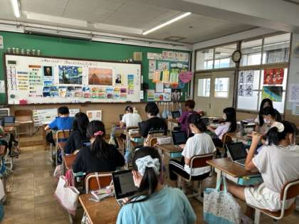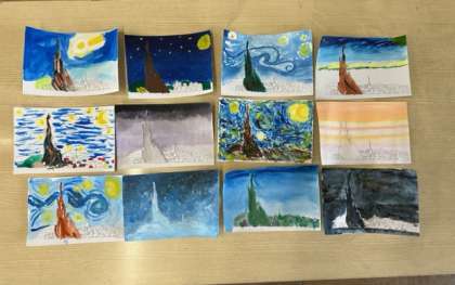 ゴッホの力強くて色彩感ある筆あとと、モネの明るく爽やかでリズミカルな筆あとを鑑賞することを通して感じたことを生かし、「やってみたい!」と思った筆あとでオリジナルの空を描いてみました。思いを込めて夢中になって描いていました。