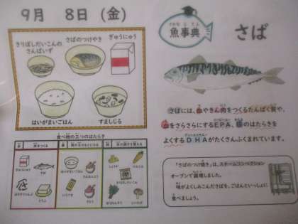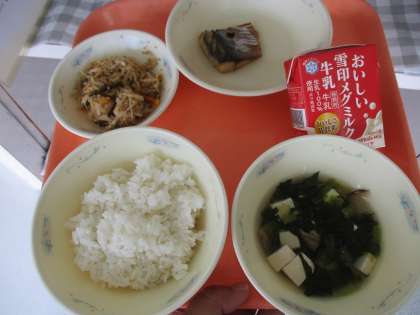 胚芽米ごはん、牛乳、さばのつけ焼、切干大根の三杯酢、すまし汁