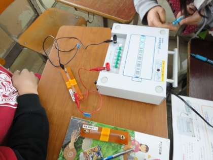 電気で熱は発生するのかどうか調べました。細い電熱線や太い電熱線を使い,発熱の仕方を比べました。上手に実験ができました。