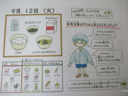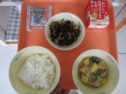 ごはん、牛乳、じゃがいものそぼろ煮、ひじきの煮つけ、じゃこ