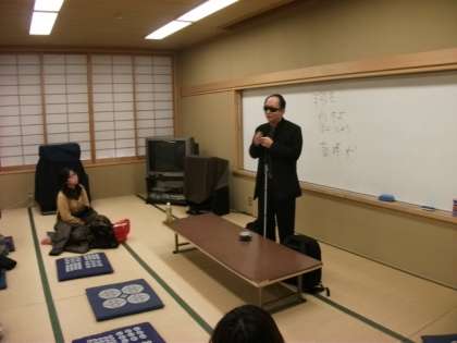京都府視覚障害者協会の松永信也さんの講演がありました。40歳の時に「網膜色素変性症」で視力を失われました。現在は,京都福祉専門学校,長尾谷高等学校などで特別講師,非常勤講師を務めるほか,学校,企業,自治体などの依頼に応じて講演をされています。講演中では,全盲と弱視の違いや現在の視覚障害者を取り巻く環境についてのお話や自分が視力を失ったときの落胆やあきらめの中から前向きに生きていく過程をお話になられました。また,視覚障害者には意識せず,気軽に「お手伝いしましょうか」などの声かけをしていただけると大変うれしいとのことでした。