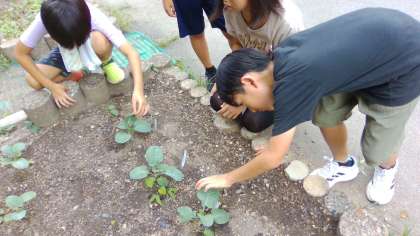 総合の時間に植えたブロッコリーが順調に成長しています。草ひきをしたり、葉っぱの裏をみて,蝶々の卵の駆除をしたりと手入れを頑張っています。収穫までにはこういった作業も必要なんだと実感することができました。