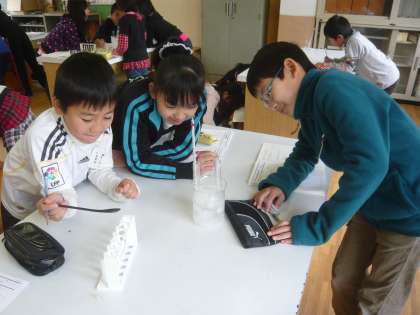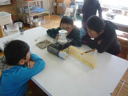 理科では「すがたをかえる水」の単元の学習をしています。子どもたちは水をあたためたり冷やしたりして,固体・液体・気体と様々な形にかわる様子を観察しました。身近にある水が水蒸気になることや0度から凍り始めることなどを知り,「うわー凍り始めたー!!」ととても楽しそう実験を行っていました。