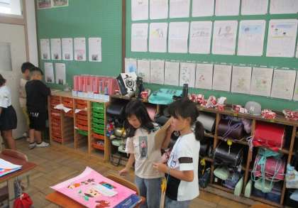 お話の絵が仕上がったので、みんなで作品を鑑賞しました。友達の作品をじっくりと見て、鑑賞カードにどんなところがよかったのか真剣に書いている姿がありました。全体交流では、しっかりと友達の作品のいいところを伝えることができていました。