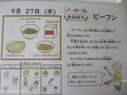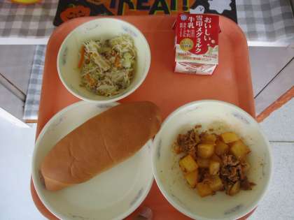 ミルクコッペパン、牛乳、豚肉のケチャップ煮、たっぷり野菜のビーフン