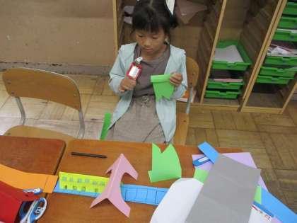 折った紙を立てていくと、動物に見えたり、車に見えたり、ビルに見えたりしたので、子どもたちは絵を描きたいという思いが出てきました。