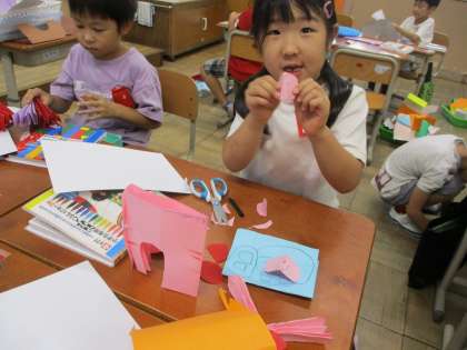 今回は、さらにはさみで切ったり、クレパスで描いたりしながら、思いついたものをどんどん作っていきました。