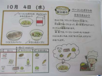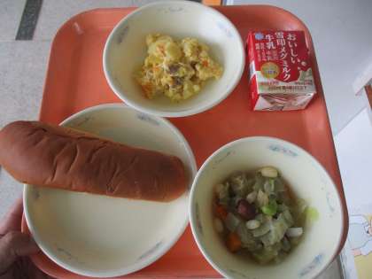 黒糖コッペパン、牛乳、ベーコンとポテトの変わりオムレツ、野菜のスープ煮