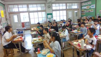 教育実習生の清水先生が、給食の時間5年生の教室に来てくれました。「質問タ〜イム」で