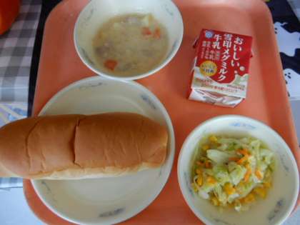 味付けコッペパン、牛乳、じゃがいものクリームシチュー、野菜のソテー