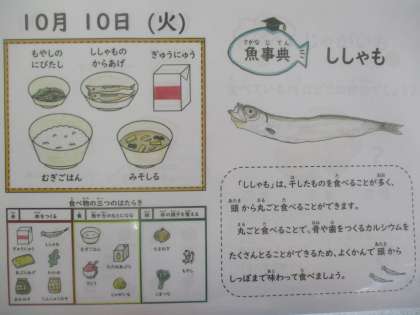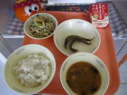麦ごはん、牛乳、ししゃものからあげ、もやしの煮びたし、みそ汁