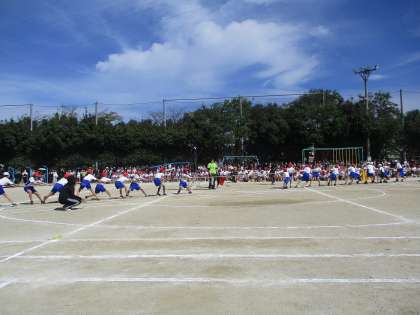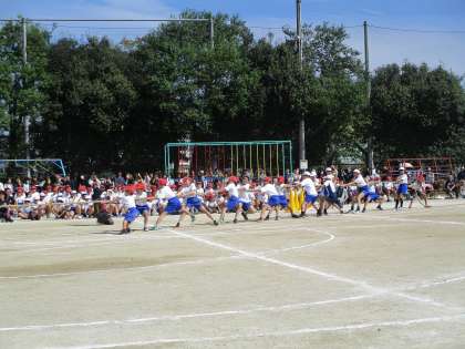 5・6年生合同つなひきの様子です。力いっぱいに綱を引きました。とても白熱しましたね!