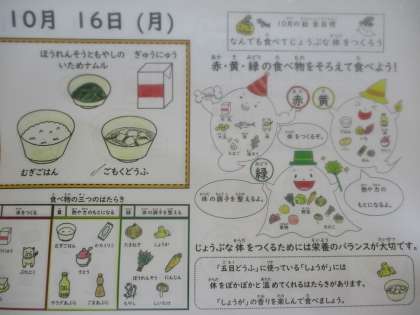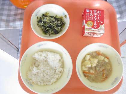 麦ごはん、牛乳、五目どうふ、ほうれん草ともやしのいためナムル