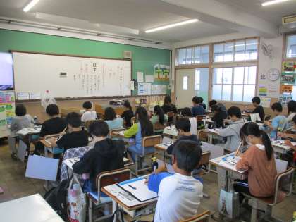 書写の学習では、「結び」の筆使いに気をつけて「はす」という字を書きました。ひらがな特有の筆使いである字形の丸みや線のやわらかさを意識しました。また、「は」の「横の結び」と「す」の「たての結び」の形や筆使いにも気をつけながら、集中して書いていました。