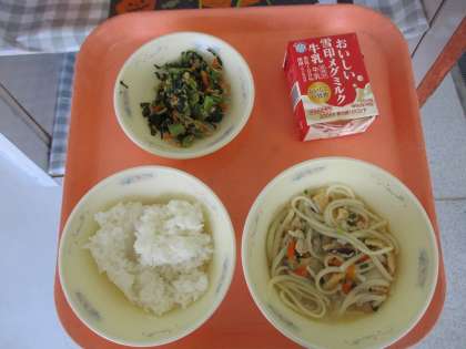 減量ごはん、牛乳、かやくうどん、ツナと小松菜のごまいため