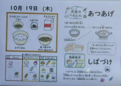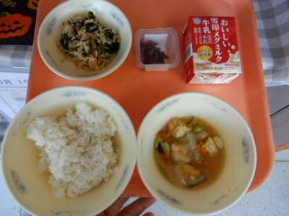 麦ごはん、牛乳、厚あげの野菜あんかけ、切干大根のごま煮、しば漬