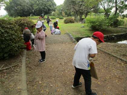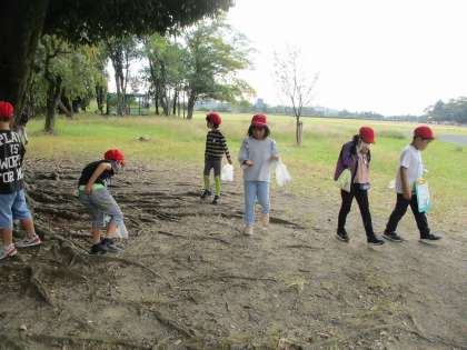 1・2年生は、秋見つけで嵐山東公園へ行きました。公園では、秋のビンゴゲームをしたり、ドングリひろいをしたりして楽しみました。2年が中心となって1年生と一緒に活動に取り組む姿が見られました。