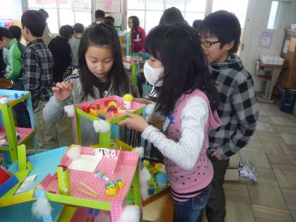 梅津北小学校では兄弟学年をつくり,お互いの学年が交流しあいながら絆を深め合うために様々な学習に取り組んでいます。先日は2年生に図画工作科の「コロコロコロガラート」を紹介し,一緒にビー玉を転がして楽しく過ごしました。4年生が2年生に転がし方を紹介するときには,ニコニコしながら楽しくお話をする姿がたくさんみられました。