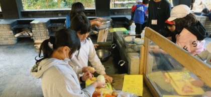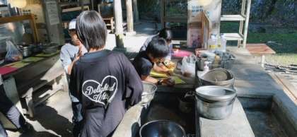 野外炊事を始めました。材料を切ったり、お米を洗ったりしています。かまどには薪を準備しています。