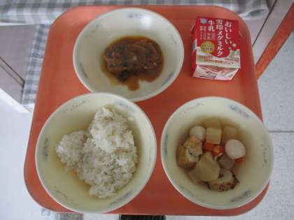 麦ごはん、牛乳、さばのみそ煮、関東煮