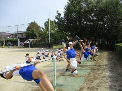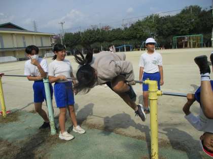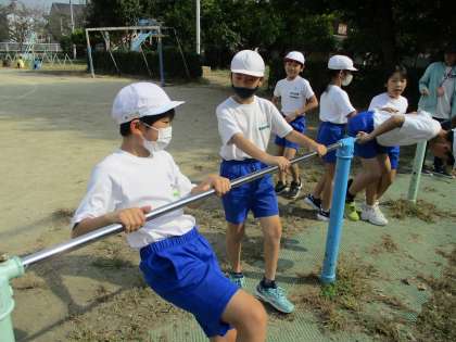 体育では鉄棒をしています。逆上がりや足かけまわりができるように練習を頑張っています。友達からアドバイスをもらいながら取り組む様子が見られます。