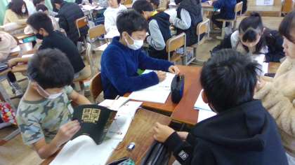 「暗号を解読せよ!」というミッションを達成するため、班で協力して暗号を解読していました。わからない漢字は辞書で調べたり友達に教えてもらったり、意欲的に学習することができました。そして全員無事、ミッションを達成することができました!!