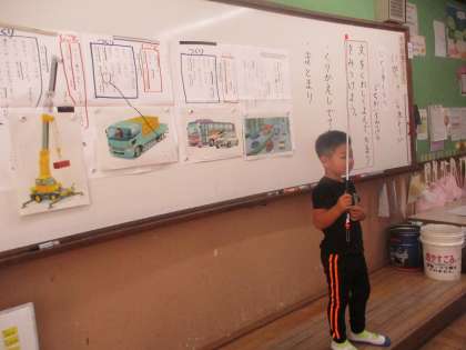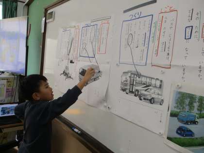 国語科では、「じどう車くらべ」の学習をしています。それぞれのじどう車はどのような「しごと」をして、どのような「つくり」になっているのか、文章をよく読んで読み取っています。