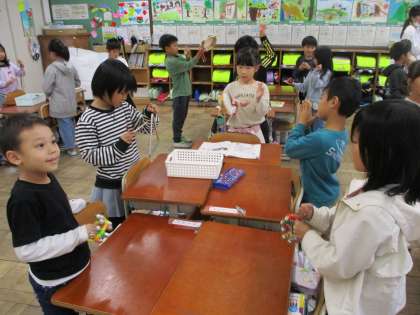 音楽科「がっきと なかよくなろう」の単元では、鈴やトライアングルやタンブリンやカスタネットの中から好きな楽器を選んで、歌に続けて鳴らしました。グループごとに発表をしたら、みんなとても楽しそうな様子でした。