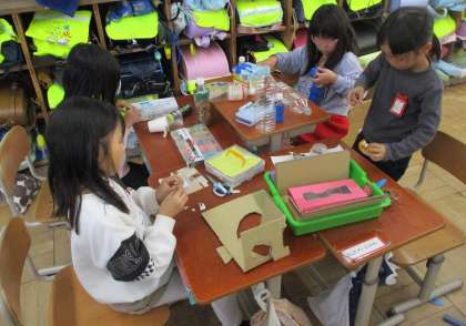 子どもたちは、グループの友達と計画を立て、材料を集め、制作しています。話し合いながら、協力して楽しそうに活動しています。