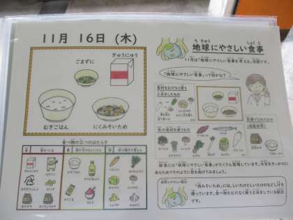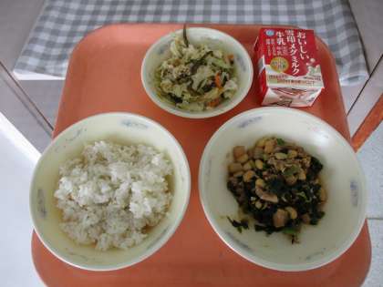 麦ごはん、牛乳、肉みそいため、ごま酢煮