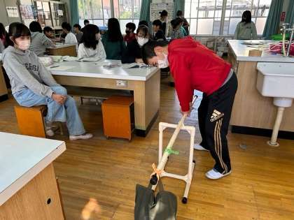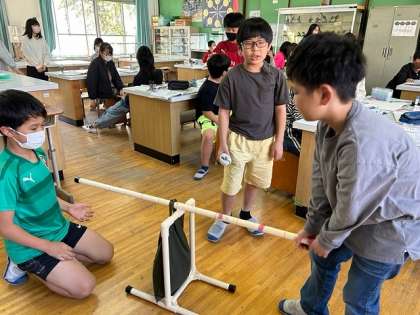 理科は、「てこのはたらき」を学習しています。てこには、支点・力点・作用点という3つの点があることを知り、重たいものを持ち上げるときにはどうしたらよいかを考えました。また、実験用てこを使って、水平になってつり合うときには決まりがあることを、自分たちで見つけることができました。いろいろな方法で試行錯誤しながら、学びを深めるすてきな姿がありました。