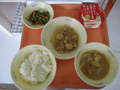 ごはん、牛乳、鶏肉のあまから煮、だいこん葉のごまいため、みそ汁