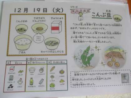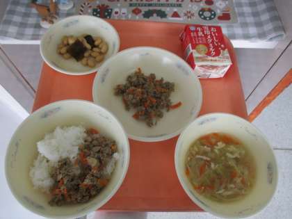 ごはん、牛乳、さばそぼろ丼(具)、こんぶ豆、キャベツの吉野汁
