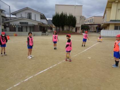 体育の学習では、「サッカー」をしています。「どうすればシュートがたくさん入るのか」「みんなが楽しめるのか」をチームで話合い活動しています。子どもたちはボールに向かって全力で走って頑張っています。