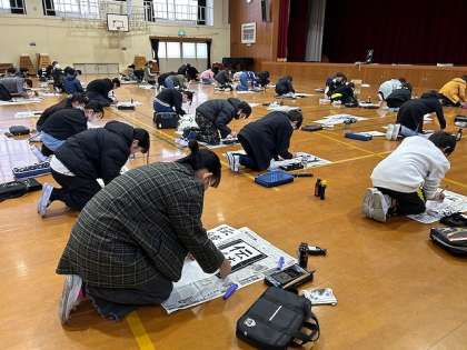 一文字一文字をゆっくりと、とても集中して書くことができました。最後に記念写真を撮りました!作品は教室に飾っています。ぜひ参観の際にご覧ください。