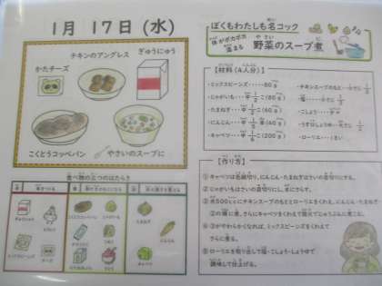 黒糖コッペパン、牛乳、チキンのアングレス、野菜のスープ煮、チーズ