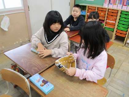 待ちに待った大谷翔平選手からのグローブが梅津北小学校の子どもたちにも寄贈されました。2年生の子どもたちも届いたグローブにとても大喜びで、サインが入ったグローブをはめてみたり、触ったりしていました。