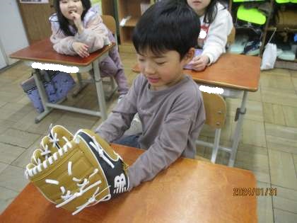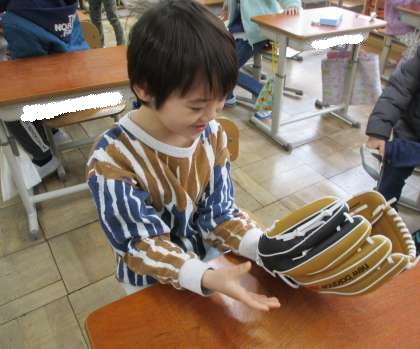 全員順番に手にはめてみました。初めてグローブをはめた子が多く、とても嬉しそうな表情をしていました。
