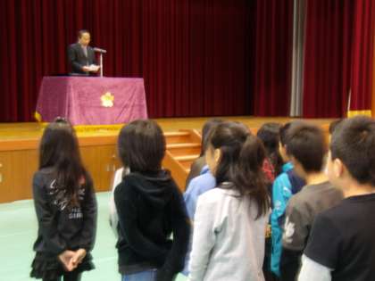 体育館において,平成23年度の修了式を行いました。あいにくの雨となりましたが,在校生を代表して5年生の伊藤圭汰さんが,校長先生から立派に「修了証」を受け取りました。昨日に引き続き,とても凛とした式になりました。今日いただいた通知票を励みに,来年度も頑張ってください。