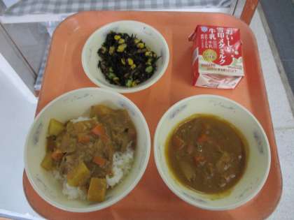 麦ごはん、牛乳、ポークカレー、ひじきのソテー