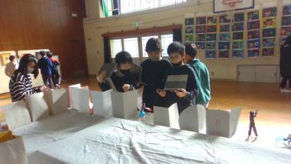 図工作品展の鑑賞会をしました。他クラス他学年の作品をじっくりみて、それぞれのよさを味わいました。友達の作品のいいところをたくさん見つけ今後の自分の作品に生かそうと、ワークシートに熱心に書き留めていました。
