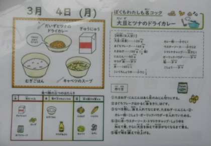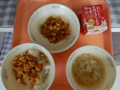 麦ごはん、牛乳、大豆とツナのドライカレー、キャベツのスープ