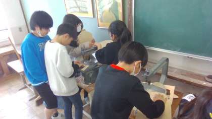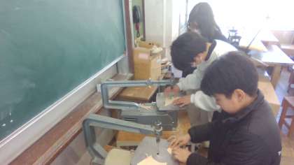 図画工作の時間に電動のこぎりを使って、作品を制作しています。うまく切れるかドキドキしながら取り組んでいました。