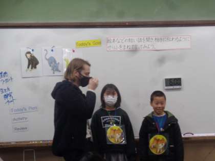本日が今年度最後の外国語活動となりました。ALTのアンディー先生と一緒に、何の動物かを尋ねる表現を使って劇をしました。子どもたちは自分が選んだ動物になりきって「私はニンジンが好きです。」「私はカラフルです。」など特徴を相手に伝えることもできました。発表に後には拍手が巻き起こるほど、一人一人ががんばっていました。