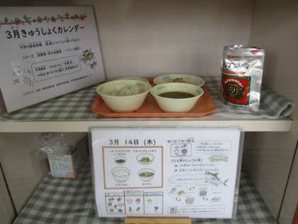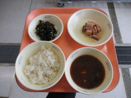 麦ごはん、なま節のしょうが煮、小松菜とひじきのいためもの、赤だし