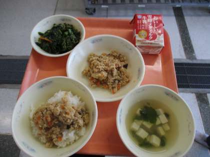 ごはん、牛乳、おからそぼろ丼(具)、ほうれん草のごま煮、みつばのすまし汁